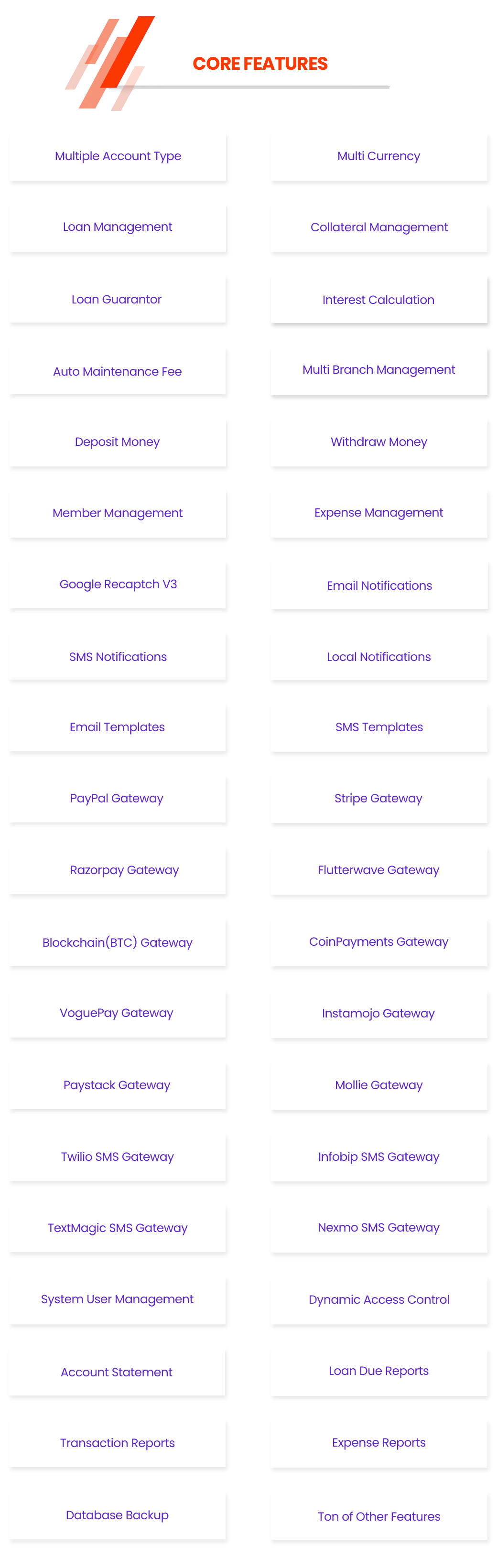 Credit Lite is a complete online credit solution for any type of finance, banking or co-operative organizations. This script comes with all essential tools for managing loans, repayments and all other loan related task. in contrast this system includes multiple account features like as savings account, checking account and also you can create different types of others account for each particular customer. This system comes with 10 popular online payment gateways such as PayPal, Stripe, Razorpay, PayStack, Flutterwave, BlockChain(Bitcoin), VoguePay, CoinPayments(Crypto), InstaMojo and Mollie. Payment gateways mainly used for automatic deposit money to customers account instantly. This script also comes with 4 popular SMS gateway so you can easily integrate your desired SMS gateway for SMS notifications.